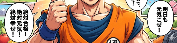 [ドラゴンボールの孫悟空が、白い歯を見せて元気いっぱいにガッツポーズをしている画像]