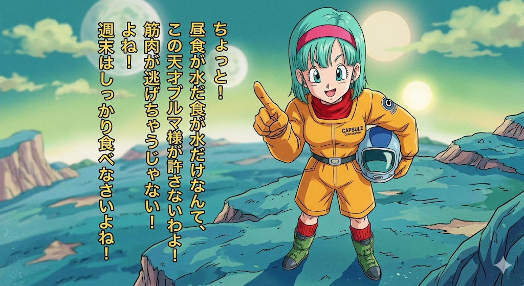 (ブログ用に作成します。ブルマがメカニックなラボで、あなたのカロリーデータをホログラムで分析しながら、少し怒りつつもエールを送っているスタイルです)