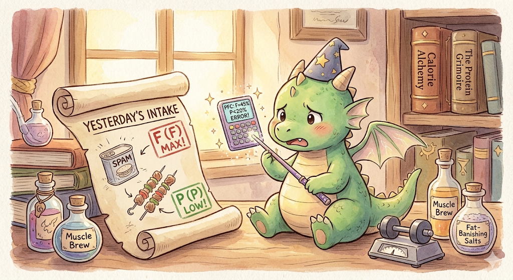 昨日の夕食の「スパム」と「羊肉串」!画像でも僕が困惑している通り、これは脂質(F)がドドンパ級じゃなくて、ギガフレア級に大爆発だる! 脂質45%は、ドラゴンの僕でも火を吹くレベルだる!「ほどよくマッチョ」の魔法をかけるには、タンパク質(P)をもっと錬成(摂取)する必要があるだる!P=17.3%じゃ、筋肉の魔法陣が不完全だる!
