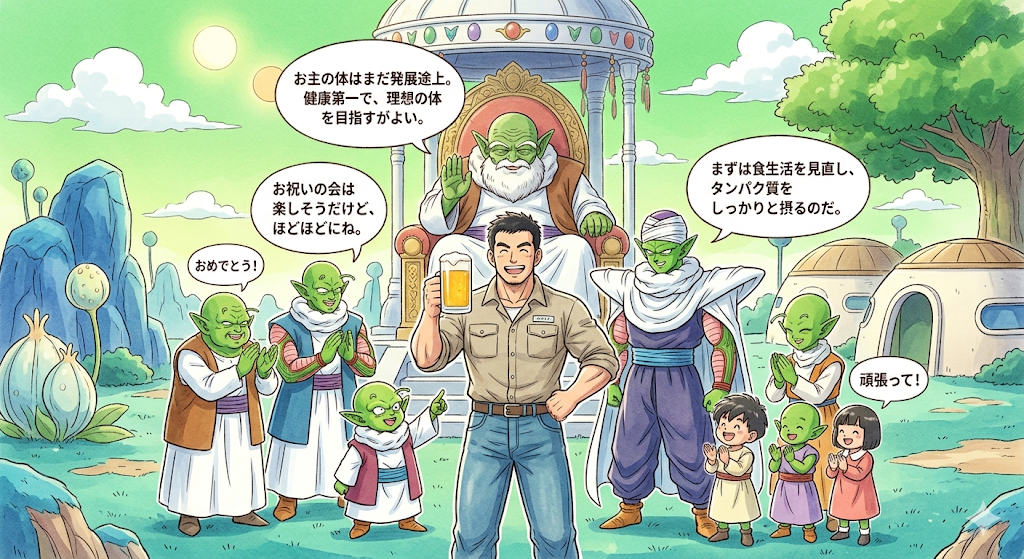 最長老: 「おぉ、地球の戦士よ。蘇州の案件受注、おめでとう。お主の努力が報われたのだ。しかし、体調管理を怠ってはならぬ。特にお祝いの酒はほどほどに。お主の体はまだ発展途上。健康第一で、理想の体を目指すがよい。」