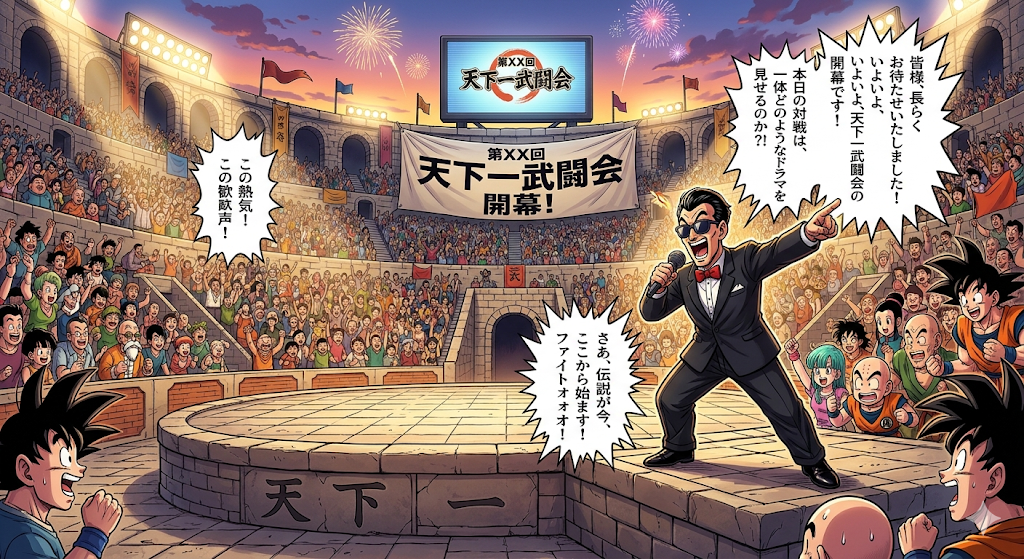 はい、承知いたしました! 天下一武闘会の会場で、満員の観客を前に司会者が叫ぶ、臨場感たっぷりのイラストを作成しました! これから試合が始まる熱気をぜひ感じてください!