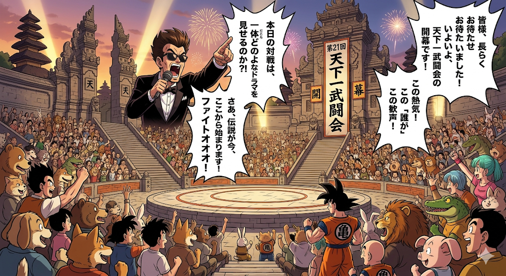 そして、観客の皆さん! そうです、ドラゴンボールの世界には、人間だけでなく動物型の獣人も多く生活しています! 観客席をよくご覧ください! 犬、猫、熊、ワニ、ライオン……様々な獣人たちが、これから始まる試合に熱狂しています! これぞ「天下一」の多様性!