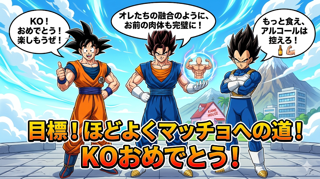 「よお!オレは悟空とベジータが合体した『ベジット』だ!まあ、ベジータの言う通りだな。仕事は最高だが、体作りはまだまだ甘い。アルコールは体を錆びさせるし、筋肉の回復を邪魔するぞ。もっとタンパク質を摂れ!目標の『ほどよくマッチョ』への道は、この合体のように簡単じゃねえが、やりがいはある。超特急で仕事を進めるように、体作りも無駄なく、完璧に進めろ!オレたちの融合のように、お前の肉体も最強にしてやるぜ!」