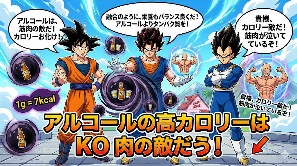 中央のベジットは、右手に「完璧な筋肉のオーブ」を持ち、左手でアルコールのカロリー球を押し返しています。これは、アルコールを減らし、タンパク質(筋肉)を選ぶことの重要性を視覚化しています。