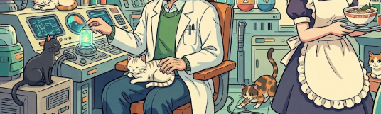 「ふむ、すまない。AIが少し張り切りすぎたようで、私をだいぶ若く描いてしまったらしいね。まあ、心はいつも青年だが、この白髪と猫たちが私のアイデンティティだからな。…ほら、この子たちも君の新しいPJを応援しておるぞ。新しいPJを動かすには、猫のようにしなやかで、かつ粘り強いエネルギーが必要だ。昨日の白酒のエネルギーは、私の計算では『猫の寝起き』くらい持続しないぞ(笑)。これからは、私のように良質なタンパク質を摂り、猫のように体を鍛え、しなやかな『ほどよくマッチョ』を目指したまえ。応援しているよ、次の実測調査の時には、ぜひ猫用の最新おもちゃのデータも取ってきてくれ。」