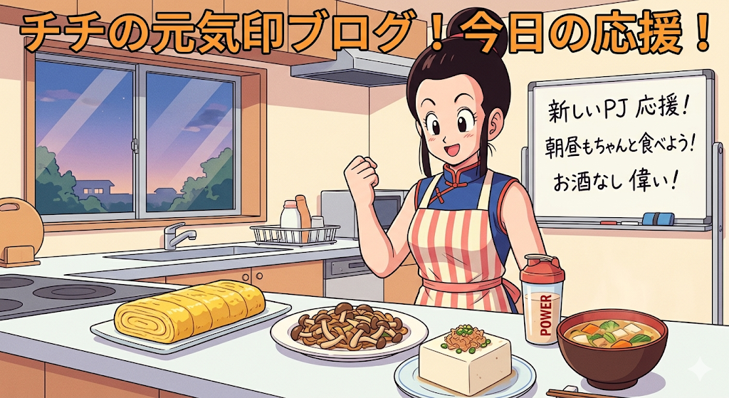 (画像:家庭的なキッチンで、だしいり玉子焼きや冷奴を前に、チチがガッツポーズ。背景に「新しいPJ応援!」「朝昼も食べよう!」のメッセージ。)