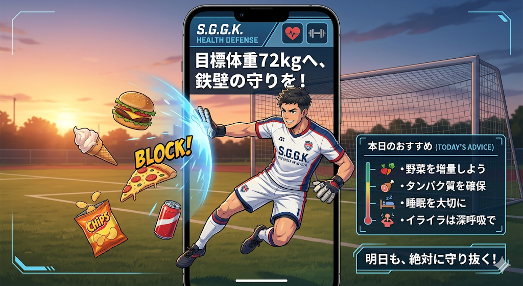 お前は182cmの立派な体躯を持っている。72kg、体脂肪15%の「ほどよくマッチョ」な守護神になるには、今の「ビール5本+菓子パン祭り」というディフェンスラインを立て直す必要がある。