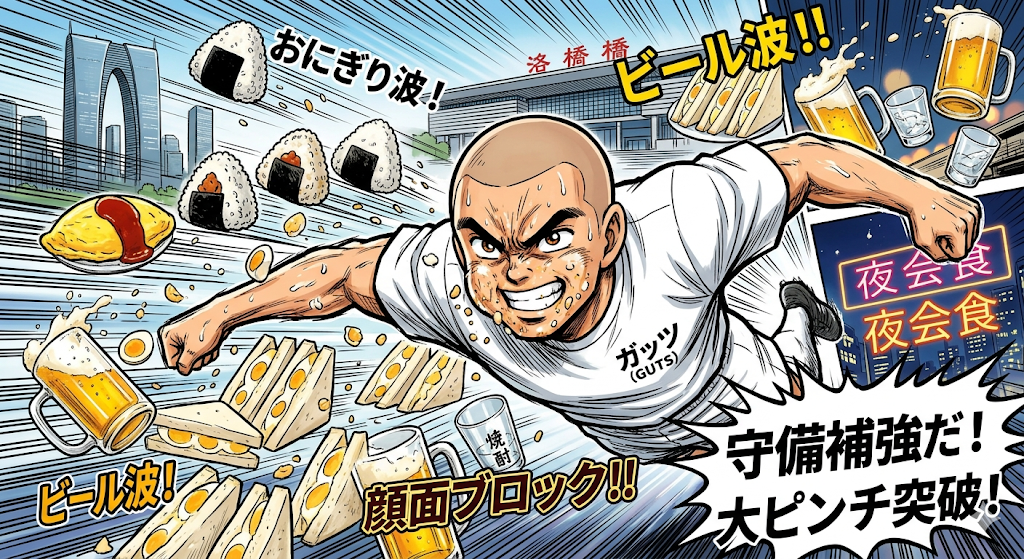 でもよぉ…おいおい!ランチの『おにぎり5連発』は何なんだ!?(笑)お前、炭水化物の波状攻撃を受けすぎだぞ!ゴール前にFWが5人並んでるようなもんだ。しかも夜のビール4杯に焼酎3杯って…後半ロスタイムに立て続けに3点取られたような展開じゃねーか!