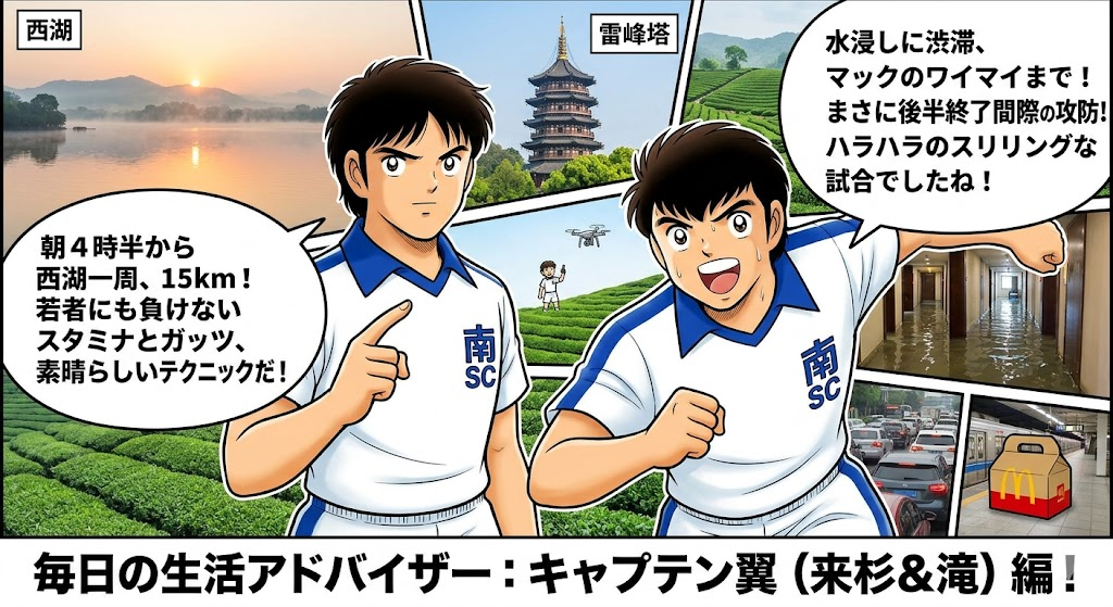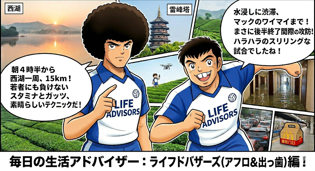 「おいおい、朝4時半から15kmウォーキングだって!?そいつはもはや散歩じゃねえ、修哲小の強化合宿並みのハードワークだぜ!若者たちがわらわらいる中で、44歳のスタミナを見せつけてやったな。西湖の霧を切り裂くようなお前のガッツ、俺のアフロも震えてるぜ!」