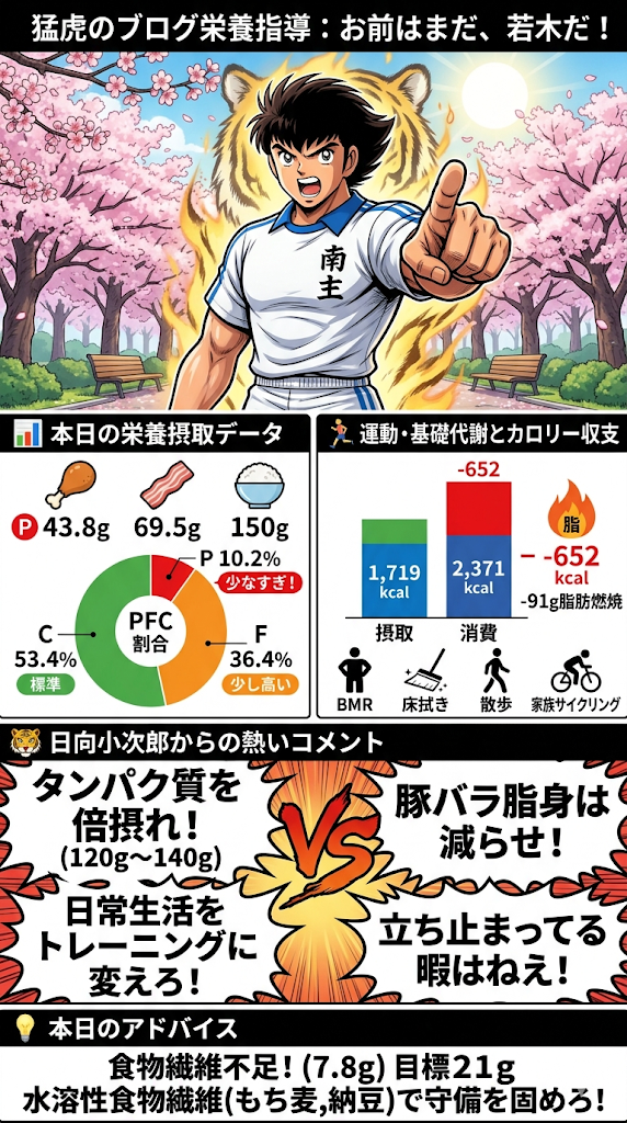 - 食物繊維の不足: 合計7.8gは少なめだ。目標は21g以上。野菜や海藻を足して、守備を固めろ!