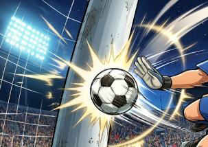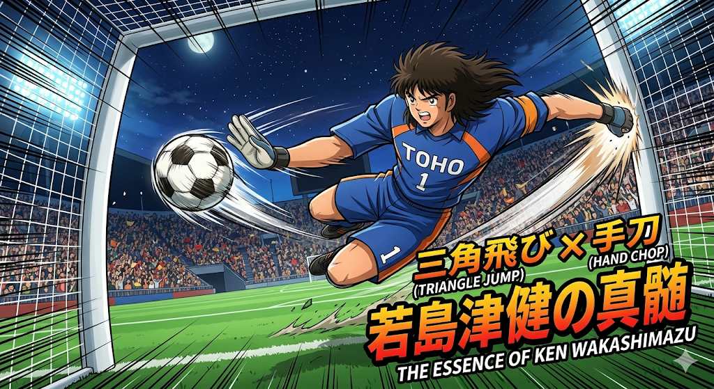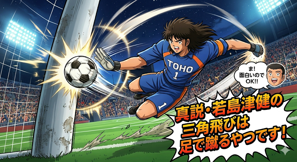 ご指摘、痛み入ります!「三角飛び」は、確かにゴールポストや壁を蹴り、その反発力でさらに高く飛ぶ、まさに若堂流の奥義でしたね。前の画像では、視覚効果として「手刀」と併せて足技を強調しきれていませんでした。