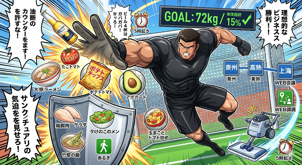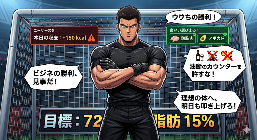 目標の72kg、体脂肪15%。それは、シュナイダーのファイヤーショットを止めるよりも困難な道かもしれん。だが、君ならできるはずだ。明日はビールの杯数を「1」に抑え、プロテインという名の「最強のバックス」を補強しろ。