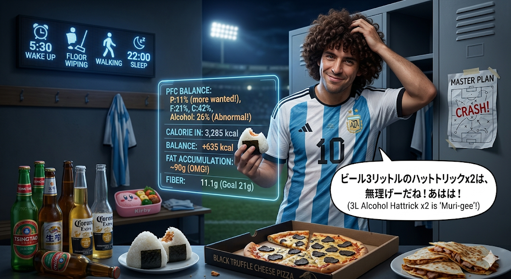 ビール3リットルにピザとケサディア、さらにおにぎり2個!あはは、君の胃袋はドライブシュートでも受けて止めたのかい?この摂取カロリー(3,285kcal)は、僕がピッチを縦横無尽に走り回って、バク宙シュートを5回決めても追いつかないよ!「ほどよくマッチョ」への道に、アルコールの壁がそびえ立ってるね。