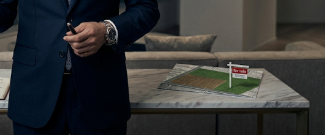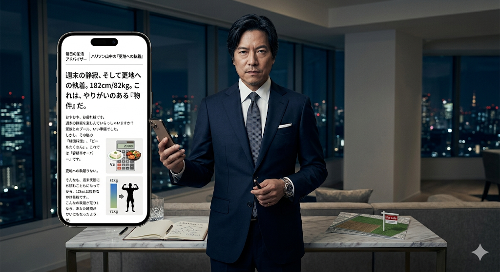 都会の夜景をバックに、鋭い眼差しであなたを見つめるハリソン山中。 彼の手元には、あなたのステータスや、週末の食事(容積率オーバー!)に対する鋭い指摘が書かれたスマートフォンが置かれています。 テーブルの上にある小さな「更地の模型」は、あなたが目指すべき「ほどよくマッチョな肉体(最高級不動産)」を象徴しています。