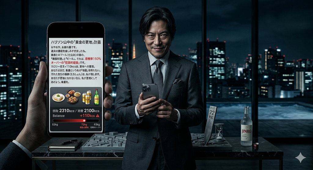 都会の夜景を背に、より深く、冷たい闇を湛えた眼差しであなたを見つめるハリソン山中。 彼の手元には、前回よりもさらに高級感のあるチタン製のスマートフォンがあり、その画面には、あなたの週末の「容積率オーバー」な食事に対する、残酷なまでのデューデリジェンス結果が刻まれています。