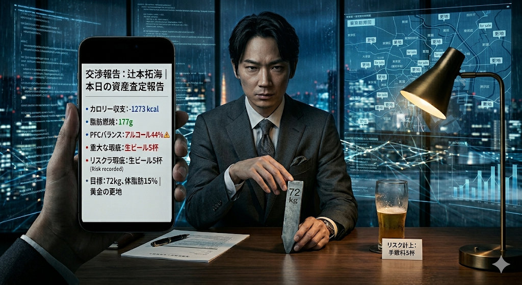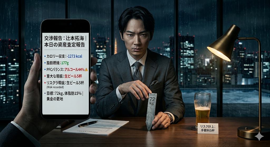 都会の雨の夜景を背に、冷徹な眼差しであなたを見つめる辻本。 彼の手元には、あなたの週末の「生ビール5杯という重大な瑕疵」と「177gの脂肪燃焼」という残酷なまでの資産査定報告が刻まれたスマートフォンがあります。