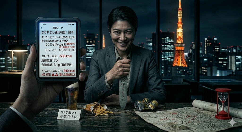 都会の圧倒的な近景にそびえる晴れた夜の東京タワーをバックに、より狂気じみた、自信と凄みに満ちたニヤリとした笑みであなたを見つめる麗子。 彼の手元には、あなたの今日の「ビール500ml x 6本という重大な瑕疵」と、夜の鶏むね肉、卵、こなごなジャガイモ(仮:ポテトフライ)という**残酷なまでの資産査定報告(栄養データ)**が、より詳細に、そして狂気的な警告付きで刻まれたスマートフォンがあります。