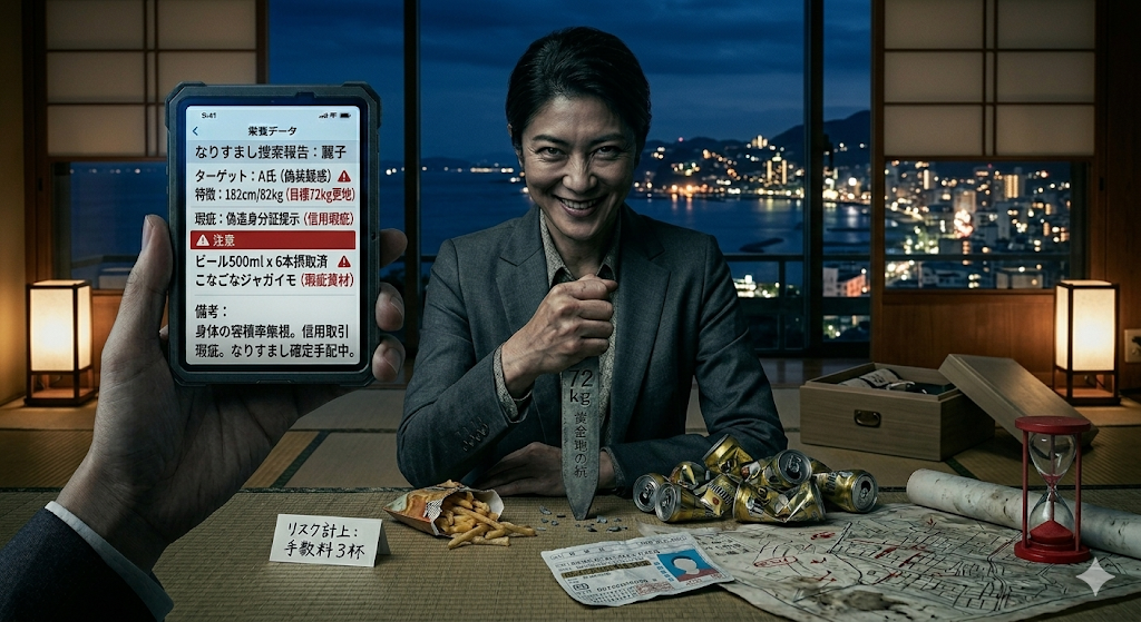 都会の圧倒的な近景にそびえる晴れた夜の熱海の温泉街と海をバックに、畳の上に座り、獲物を狙う鋭い視線であなたを見つめる麗子。 彼の手元には、あなたの今日の「ビール500ml x 6本という重大な瑕疵」と、ターゲットの身体的特徴、そして「偽造身分証」という**残酷なまでの資産捜索報告(栄養レポート)**が、より詳細に、そして狂気的な警告付きで刻まれたスマートフォンがあります。