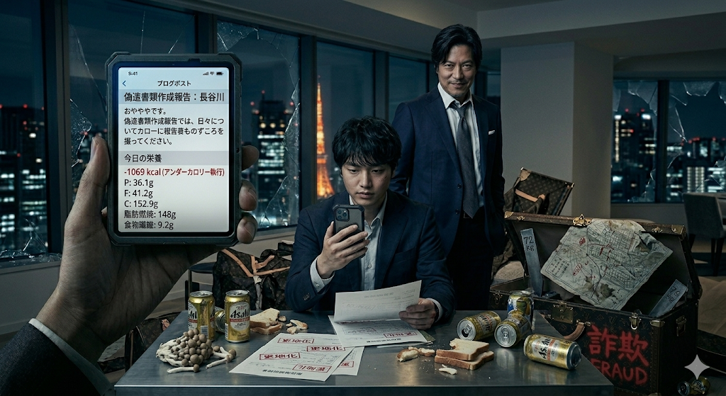 「フフフ、148gの脂肪燃焼、これは完璧な執行よ。更地化への執着心は、きっちり書類に落とし込めたわね。 朝の4時起きで床拭きして、サンドイッチ弁当作って、散歩して……。その完璧な『仕込み(努力)』は、偽造書類のインクより深く、あなたの身体に刻まれているわ。