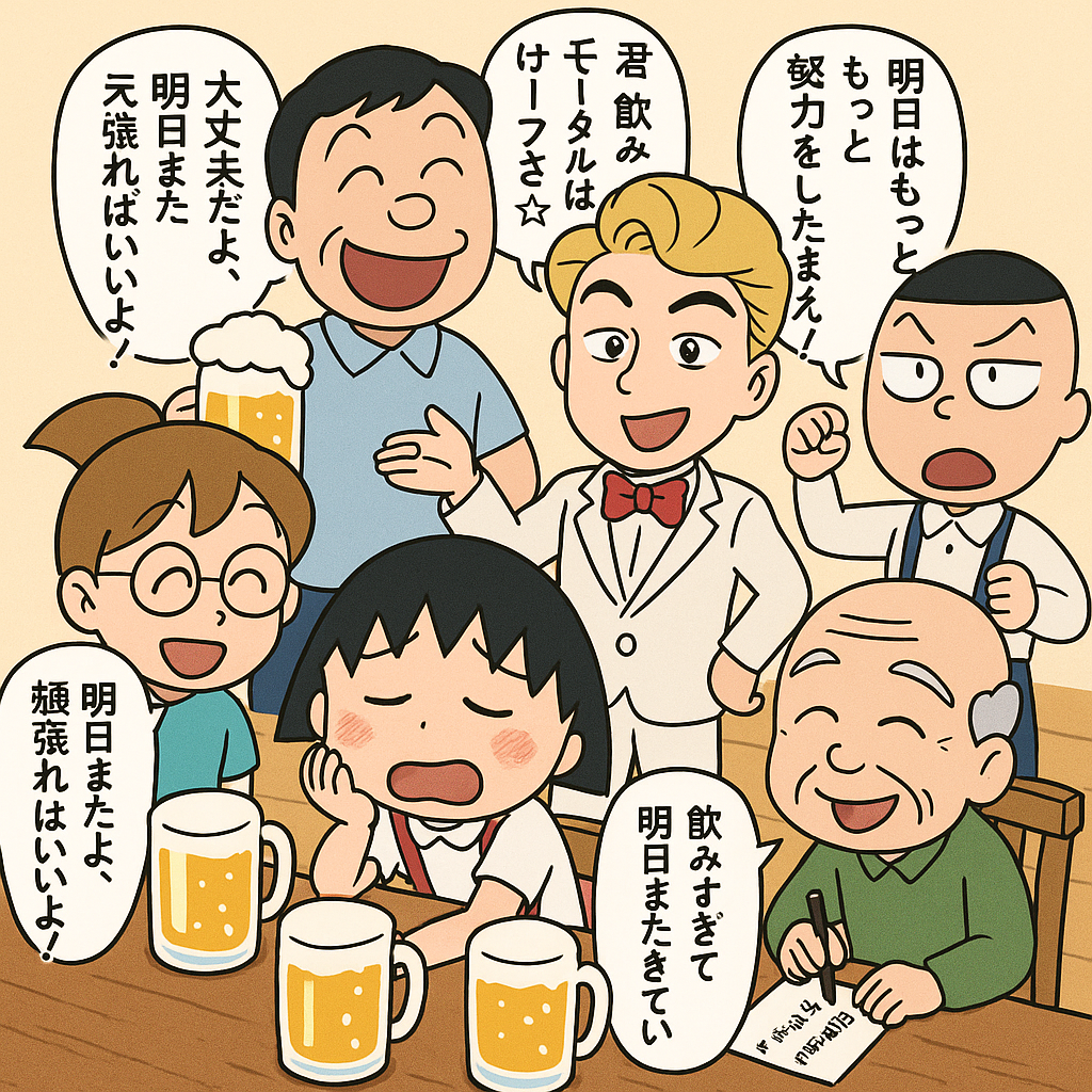 - ひろし(父):ビールジョッキを片手に「まぁ飲むのも人生だ!」と豪快に笑っている。
