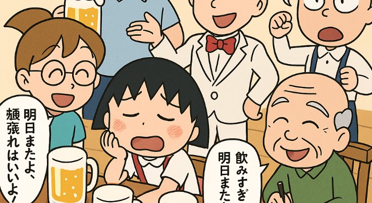 - まる子:テーブルに突っ伏しながら「ビール飲みすぎちゃった〜」と笑顔で弱音を吐いている。