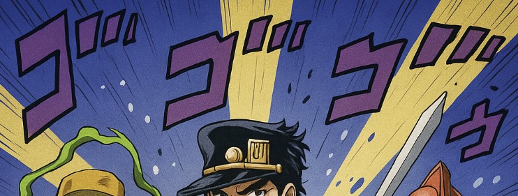 - 背景:カラフルなジョジョ風集中線と擬音(ゴゴゴゴ…)