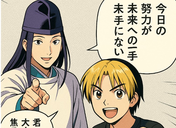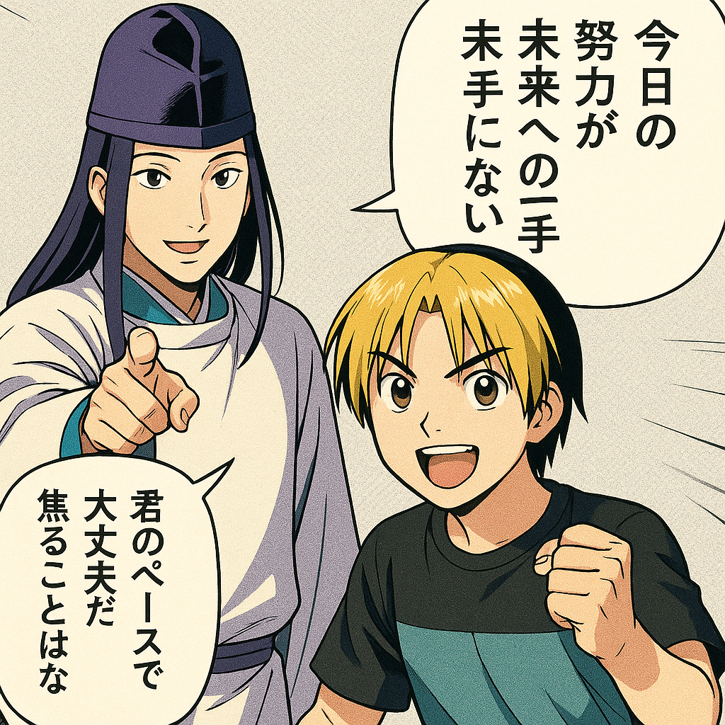 - 師匠風キャラ:長髪で和装のキャラが優しく応援する