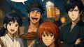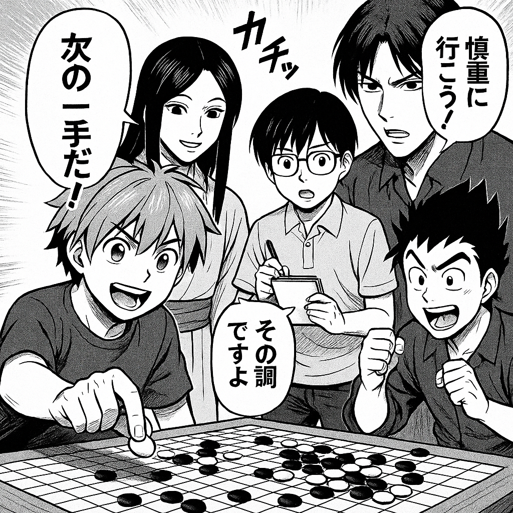 「ヒカルの碁」風の漫画タッチで描かれたオリジナルキャラクターたちが、碁盤を囲んで応援しているイラスト を作成しましょう。