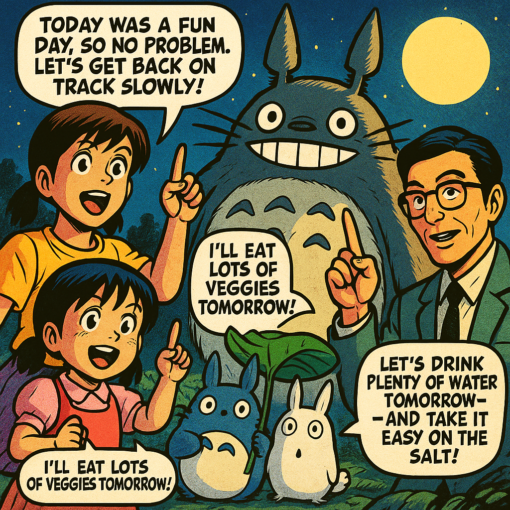 「大事なのは、“楽しい夜を後悔にしない”こと。楽しかった分だけ、明日を少し整える。それでいい。月はまた満ちては欠ける。体も同じだよ。欠けたところに、また満ちていく。さあ、おやすみ。明日もいい一日になる。トトロも、きっと見ているから。」