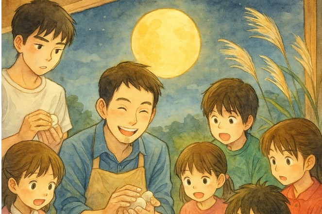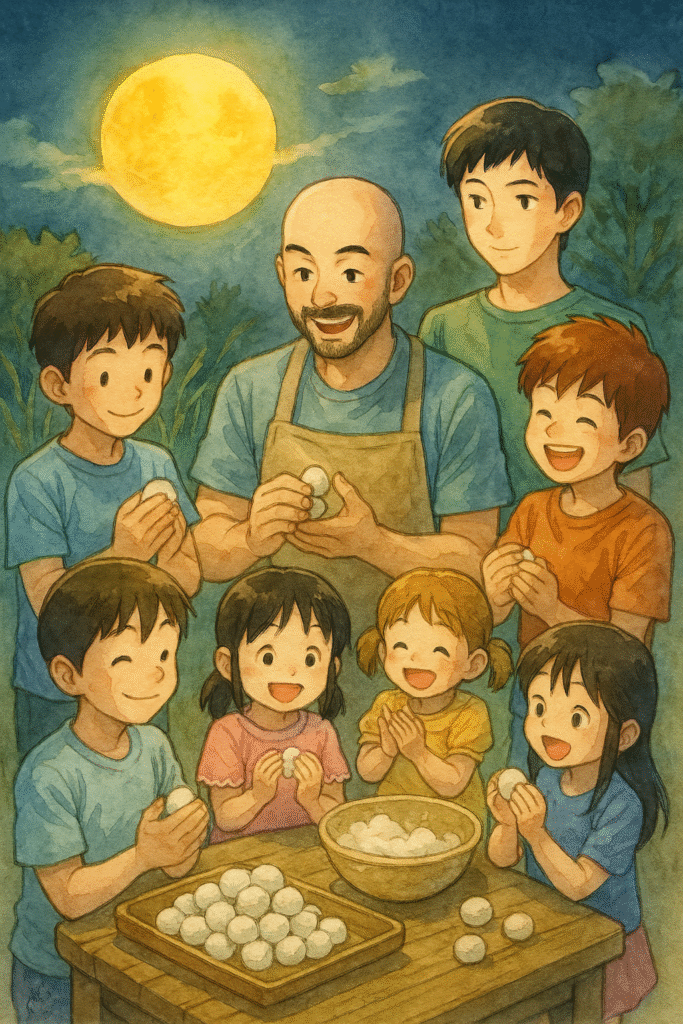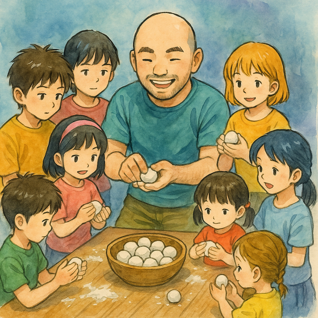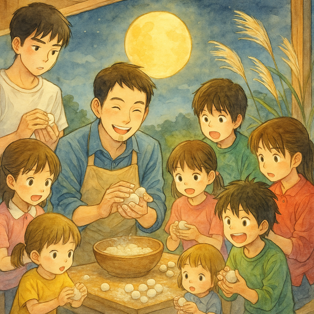 子どもたちがわいわい笑いながらお団子をこねる光景、そしてあなたが講師として教える姿、まさに“秋の月と笑顔の教室”って感じです。