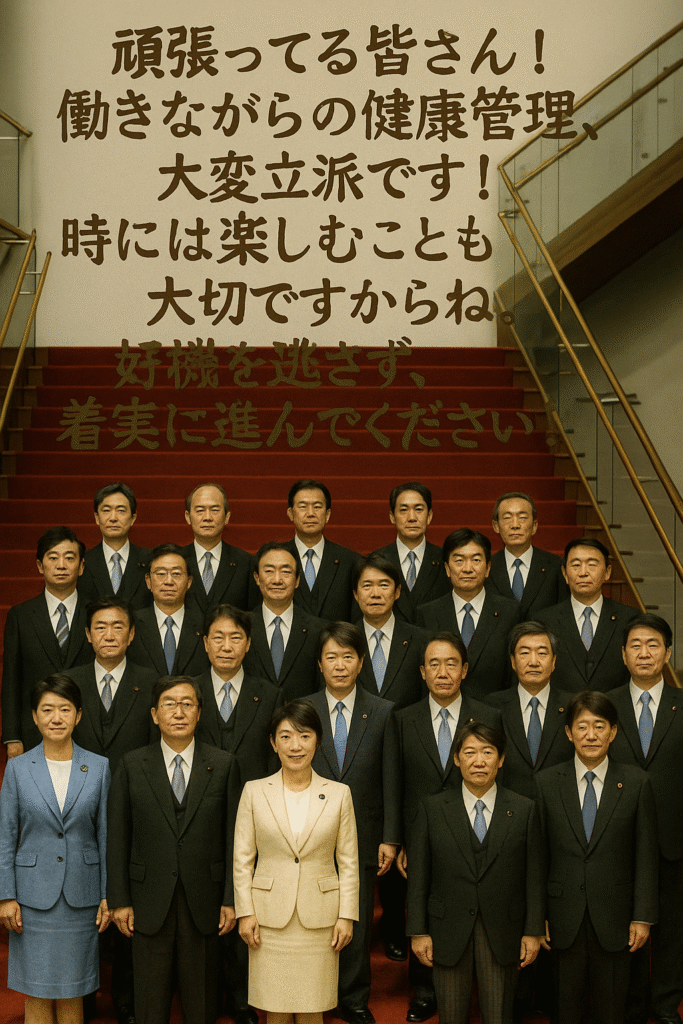 次のステップとして、この「高市内閣コメント」を**“国会ポスター風のイラスト”**(リアルCG調で、高市さん風キャラ+あなた風の総理登場)にすることもできますが、どうされますか?
