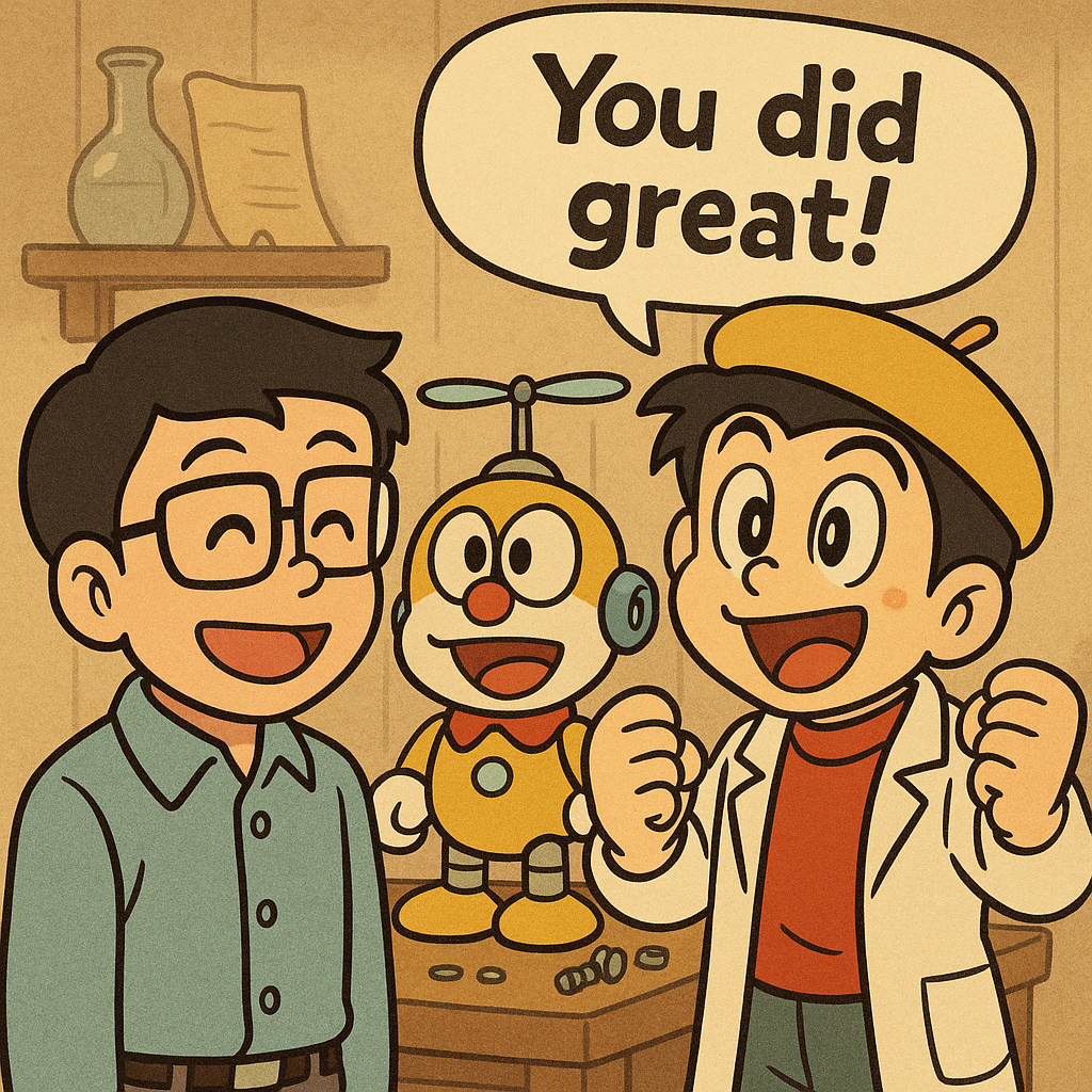 「昭和アニメ風タッチで応援してくれるキャラ」 「キテレツ世界観っぽい発明品の前でほめられてる自分」この二つをミックスした感じでお願いします!
