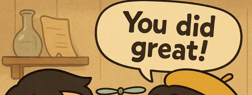 - 発明家キャラがあなたに「You did great!」と褒めている構図