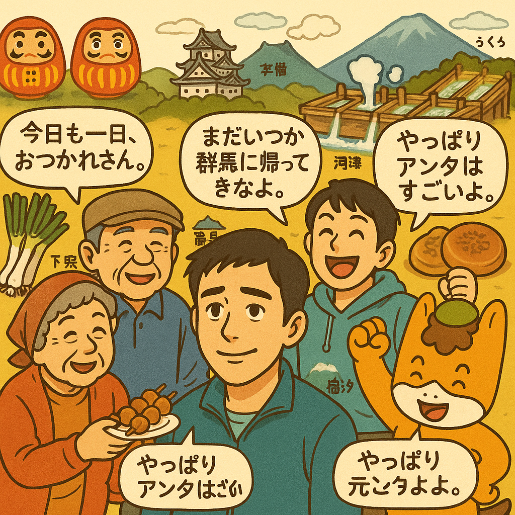 (高崎・前橋あたりのおじさんおばさん+若者代表、みんなでしゃべってる感じで)