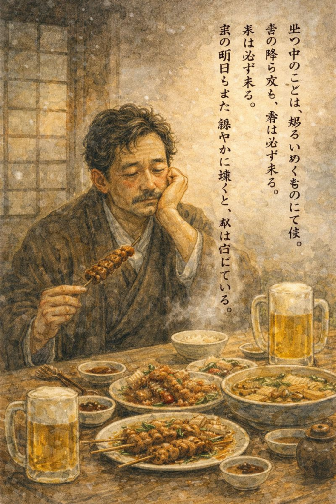 壮行会にて、酒と料理が並び、つい箸も杯も進む。されどそれは、ただの放縦ではなく、人と人との縁を結び直す「場」の力にて候。五人で語り合い、送り出す心を交わすことは、書き残さねども確かに胸に積もるもの。君が「結構食べる」と記したのは、恥ではなく、正直のしるし。正直は、やがて修正の道を開く。