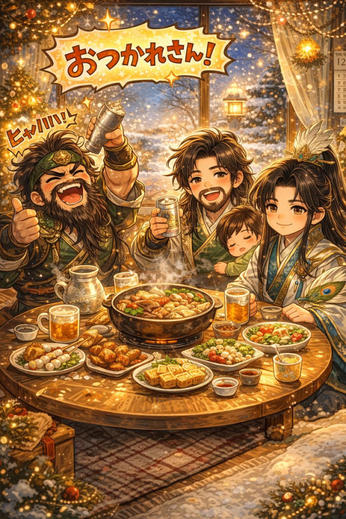 イラストリクエストは数日前から三国志シリーズでした!! 今回はまとめで、コメントを関羽、張飛、劉備、孔明を入れた、かわいい感じのイラストにしてください!!画像が作成されました • 冬の夜の宴