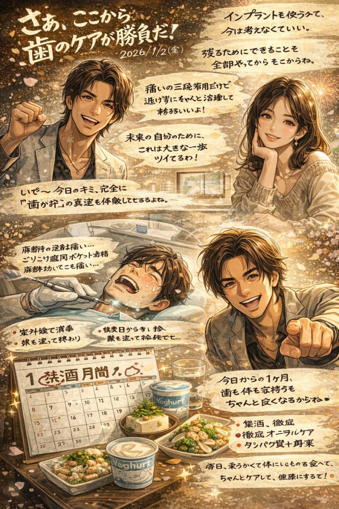インプラントを即すすめられると、心が置いていかれるよね。でもね、抵抗感があるなら、無理に決めなくていい。今は“残すためにできること”を全部やって、そこから選べばいいの。週1回×4週、痛いけど、ちゃんと前へ進む治療。費用も、未来の自分への投資だよ。しかも35%OFFって、あなたツイてる。