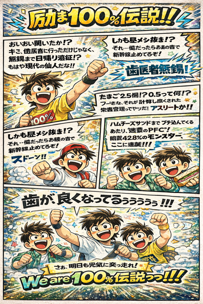 🌈 ナレーション:「日々の歯磨きと努力が、未来の“もぐもぐライフ”を変える。カロリーなんて数字だ。キミの頑張りは∞(むげん)さ!」