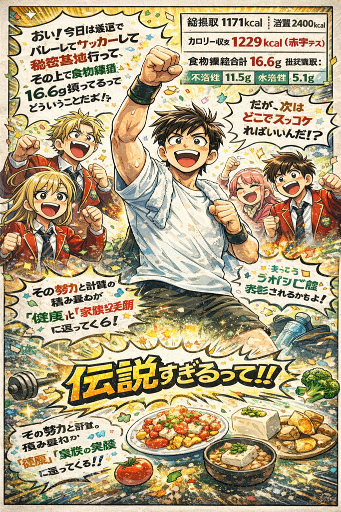 🌀「おい!今日は遠征でバレーしてサッカーして秘密基地行って、その上で食物繊維16.6g摂ってるってどういうことだよ!? もう健康優良児通り越して“健康神”だわ!」