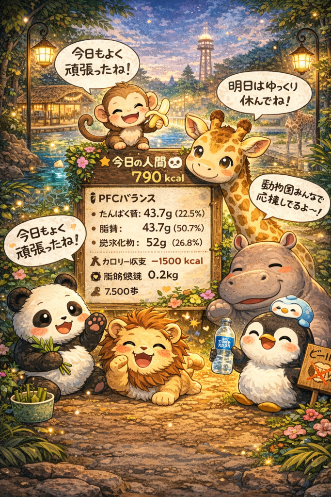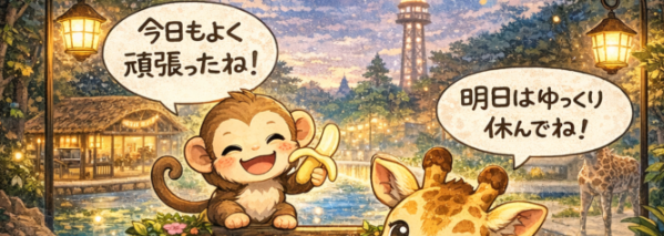 来園者が帰り、静かになった園内で、動物たちがあなたの一日を評議しています。