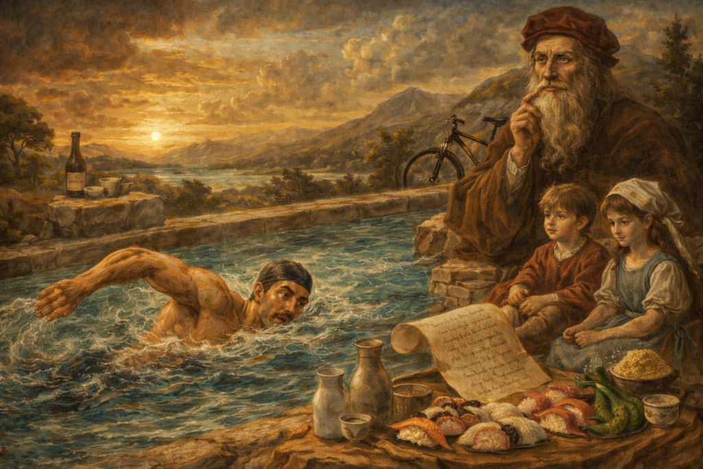 水に戻った君よ、よくやった。水は形を持たないが、最も強い。器に従い、岩を削り、時に波となって人を運ぶ。君が今日プールで感じた「久々の疲れ」は、身体が新しい線を引き直している証拠だ。私は絵も機械も、一気に完成させたことはない。必ず小さな試作と観察を積み重ね、失敗の跡すらスケッチした。君も同じだ。毎週プールに連れて行く——その“繰り返し”が、家族の体力も君の体脂肪も、静かに彫刻していく。今日の食は賑やかで、酒も寿司も波のように押し寄せた。ならば次は、波を読む番だ。翌日を整え、また泳ぐ。水溶性食物繊維で腸を滑らかにし、睡眠で回復の歯車を噛み合わせる。君の勝利は一日で決まらない。連作のように、明日も一筆。さあ、次の“作品”へ。
