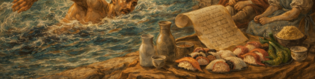 ルネッサンスの重厚感+夕景+「泳ぐ/寿司/酒/ダ・ヴィンチ」という情報量の多さが、逆に“物語のある絵”になりましたね。