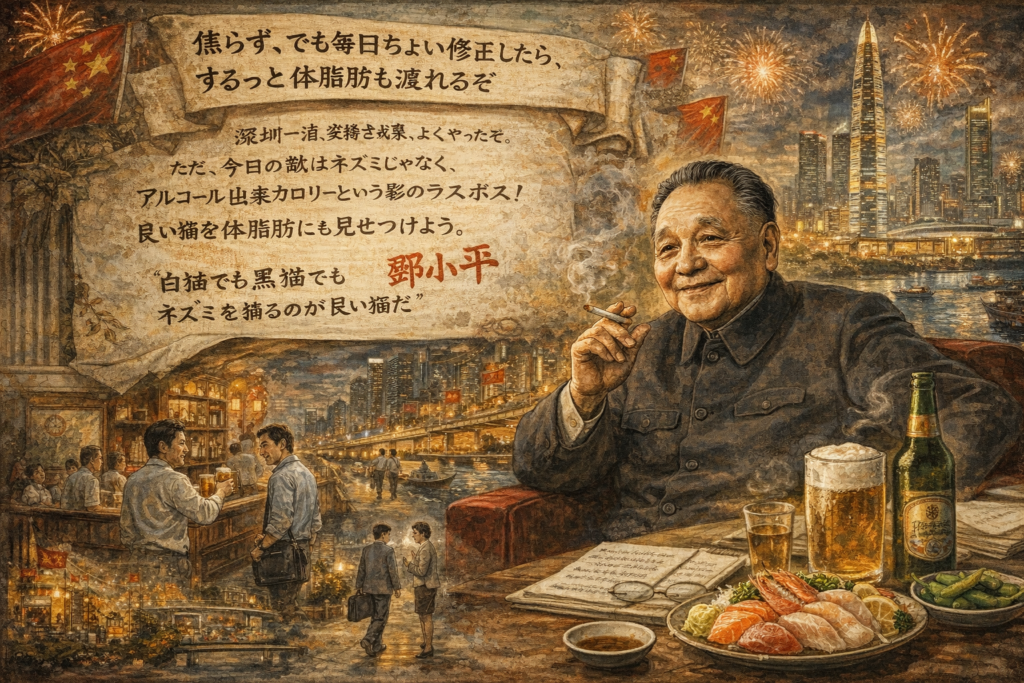 ただし今日の敵はネズミじゃない、アルコール由来カロリーという影のラスボス!ビールは仲間に見えて、実は「静かに体脂肪に投資させる」タイプ。ここは鄧小平流に、極端な我慢じゃなく“現実的な最適化”。例えば次回、最初の1杯は生でOK、2杯目以降はハイボール薄めorノンアル混ぜ、刺身→枝豆→うな重の順で、同じ満足度でも吸収の角度が変わる。