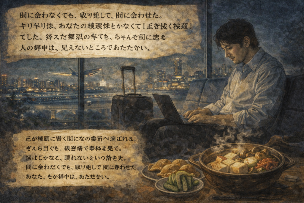 間に合わなかった便、ぎりぎりでつないだ打ち合わせ。今日は、足が地面に着く前から次の場所へ運ばれていくような一日でしたね。それでもちゃんと“着地”して、仕事を回して、夜は湯豆腐で身体を戻している。これ、地味だけど強いです。