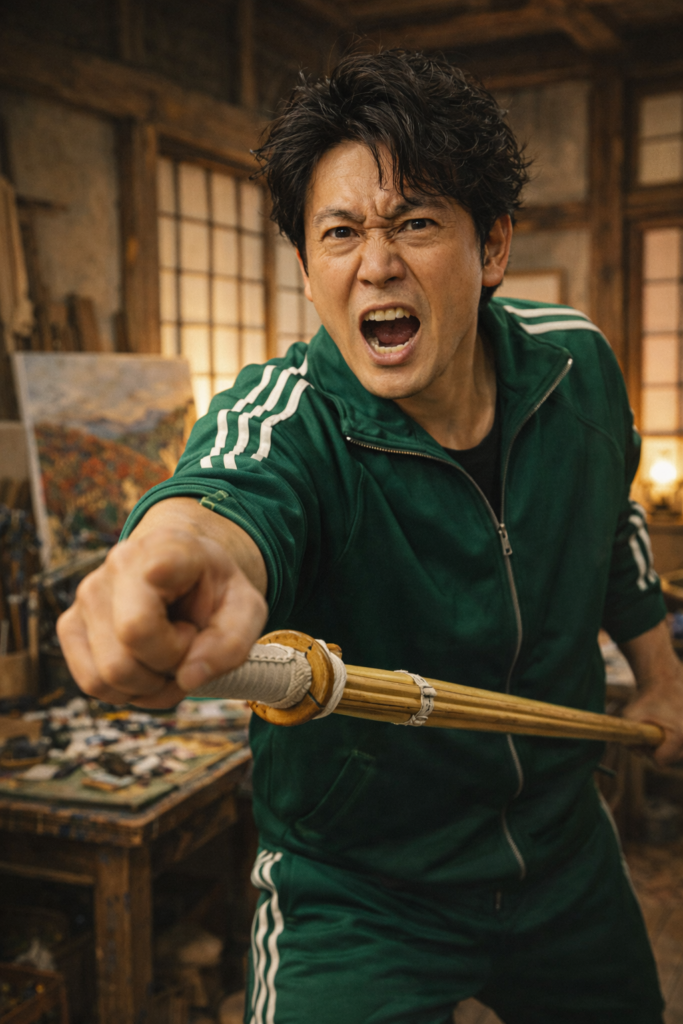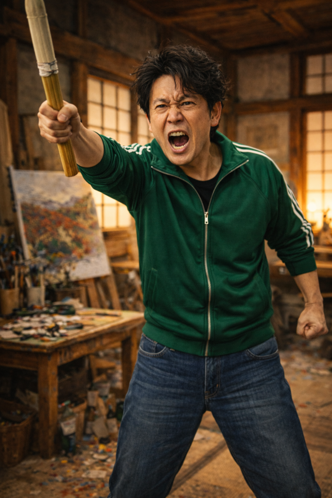 緑ジャージ+ジーンズ+竹刀「描けー!」、締まりましたね(笑)古民家アトリエの空気感もいい感じでした。