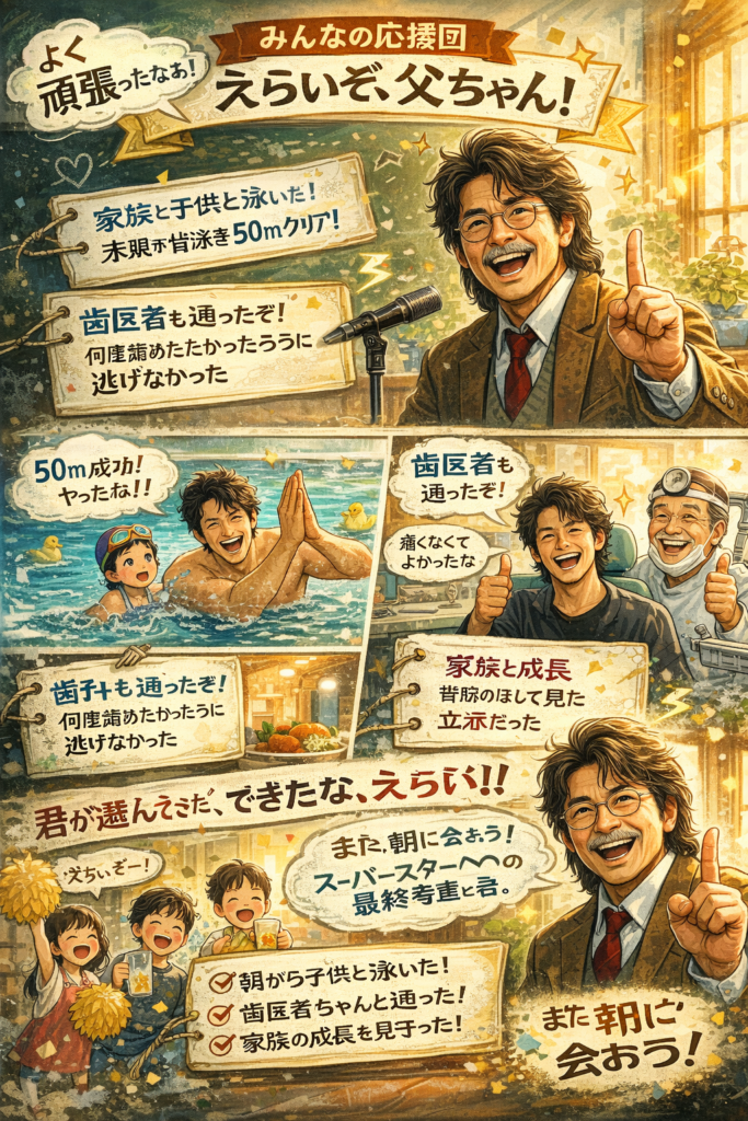君はさ、家族の予定も自分の体も、ちゃんと回してる。そういう人が一番強いんだよ。さあ、今日の勝ちは「歯が順調」「プール行った」「家族の成長見た」。十分だ。胸張って寝ろ!