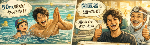 - 要素:プール・歯医者・家族の達成感を“黒板の箇条書き”で表現(リアル人物は出しすぎない)