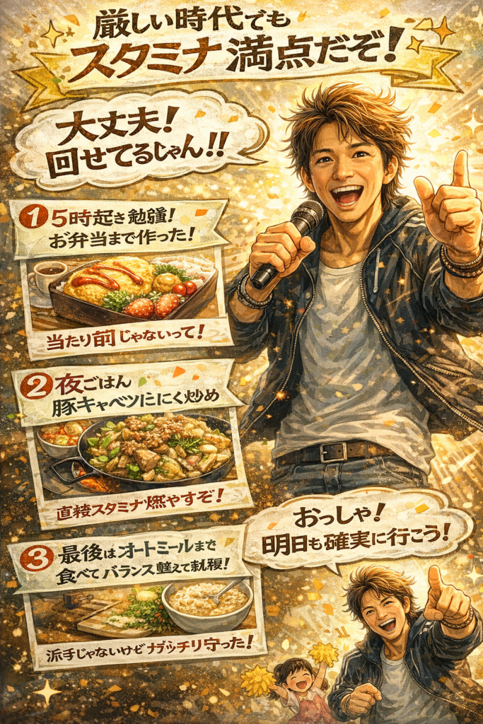 厳しい時期ってね、気合いで乗り切ろうとすると折れやすいんだよ。だからこそ「やることを小さくする」。今日のあなたみたいに、朝のルーティンと、夜の温かい食事。この2つがあるだけで、明日また立てる。