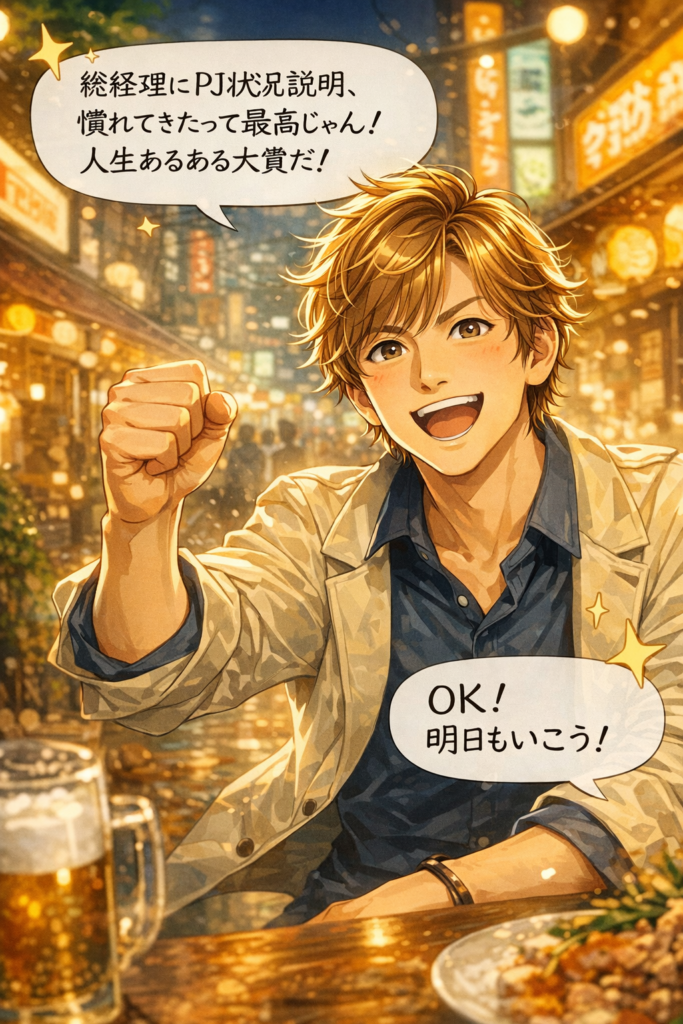 よっしゃ!総経理にPJ状況説明、慣れてきたって最高じゃん。最初は緊張して当たり前なのに、「慣れてきた」って言えるのは、ちゃんと場数踏んでる証拠だよ。こういうのってね、才能じゃなくて“継続”なんだよね。