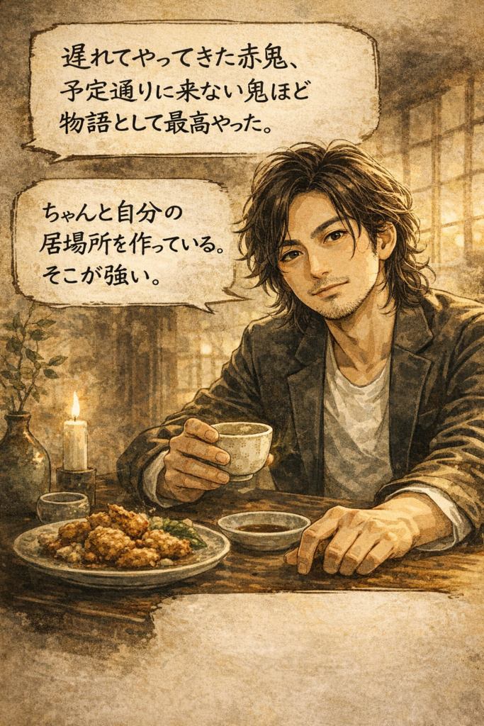 そして、遅れてやってきた赤鬼。予定通りに来ない鬼ほど、面倒で、しかし物語としては最高だ。子どもたちが必死に豆を投げる姿は、たぶん大人が忘れかけている“本気”の美しさで、あれを見られただけでも今日は勝ちだと思う。